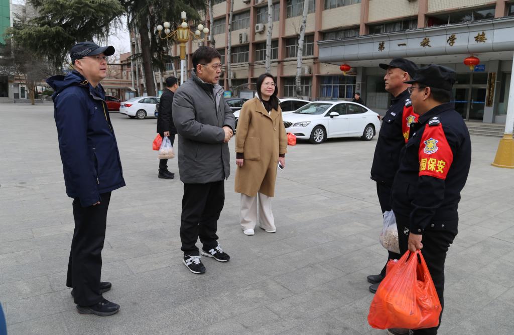 校领导一行先后来到学校总值班室、南门、网信中心、校医院、电工班、宿舍楼现场,看望慰问坚守岗位的一线职工,与大家亲切交谈,详细了解寒假期间校园安全保卫、消防管理、供暖运行、电力保障、网络信息服务、基础设施应急维护等各项工作的落实情况。
